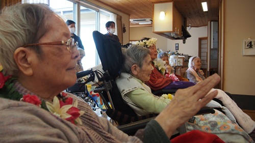 入居者との会話の中で、職員が習っているフラダンスの話になり、「踊っているところを観てみたい」と、話が盛り上がりました。その声に職員も応える形で計画を立て、東の家リビングでミニコンサートが開催されました。