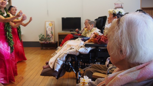 フラダンスの優雅な動きに合わせて手を動かしたり、音楽のリズムに合わせて手拍子をしたりと、思い思いの方法で楽しまれました。「きれいね」と涙を流しながら観ている方もみえ、鑑賞された方にとっても、職員にとっても、素敵な時間となりました。