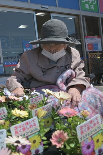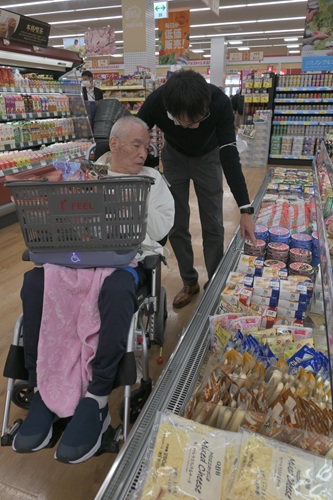 落合公園で花見を楽しんだ後は、中庭に植える為の花や、おやつを買いにスーパーに向かいました。それぞれに、商品棚を見ながら手に取ってカゴに入れていきました。