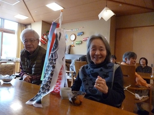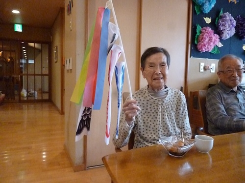 子供の健やかな成長を願う日ですが、入居者様の健康と長寿を願い、お祝いご膳にしました。お豆腐は、鯉のぼりをイメージしています。皆様に大好評のあんみつは、おやつで召し上がっていただきました。「昔は大きな鯉のぼりを飾っていたのよ」と、懐かしいお話で盛り上がっていました。