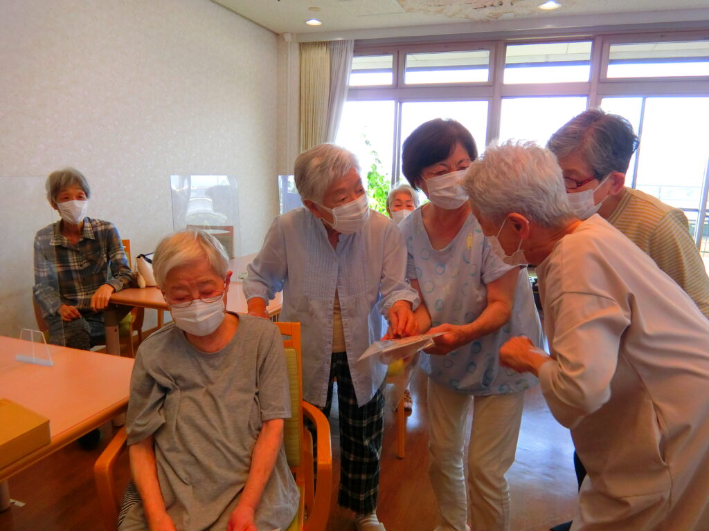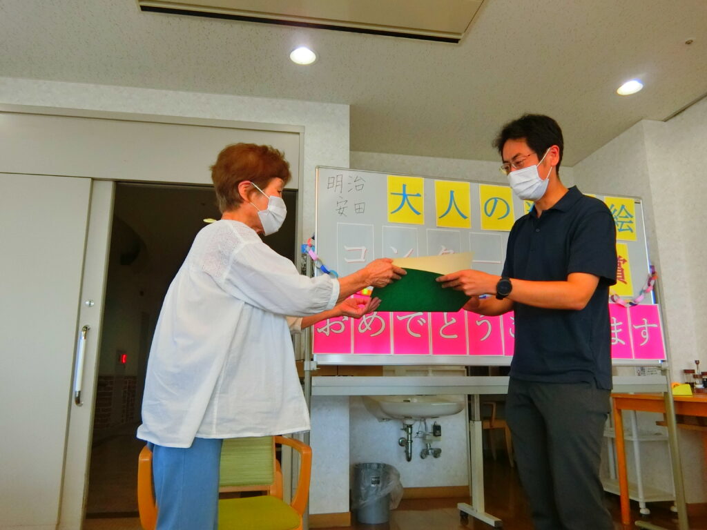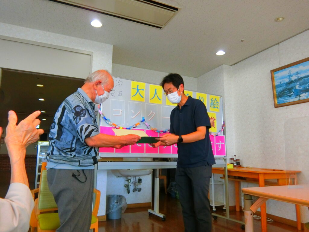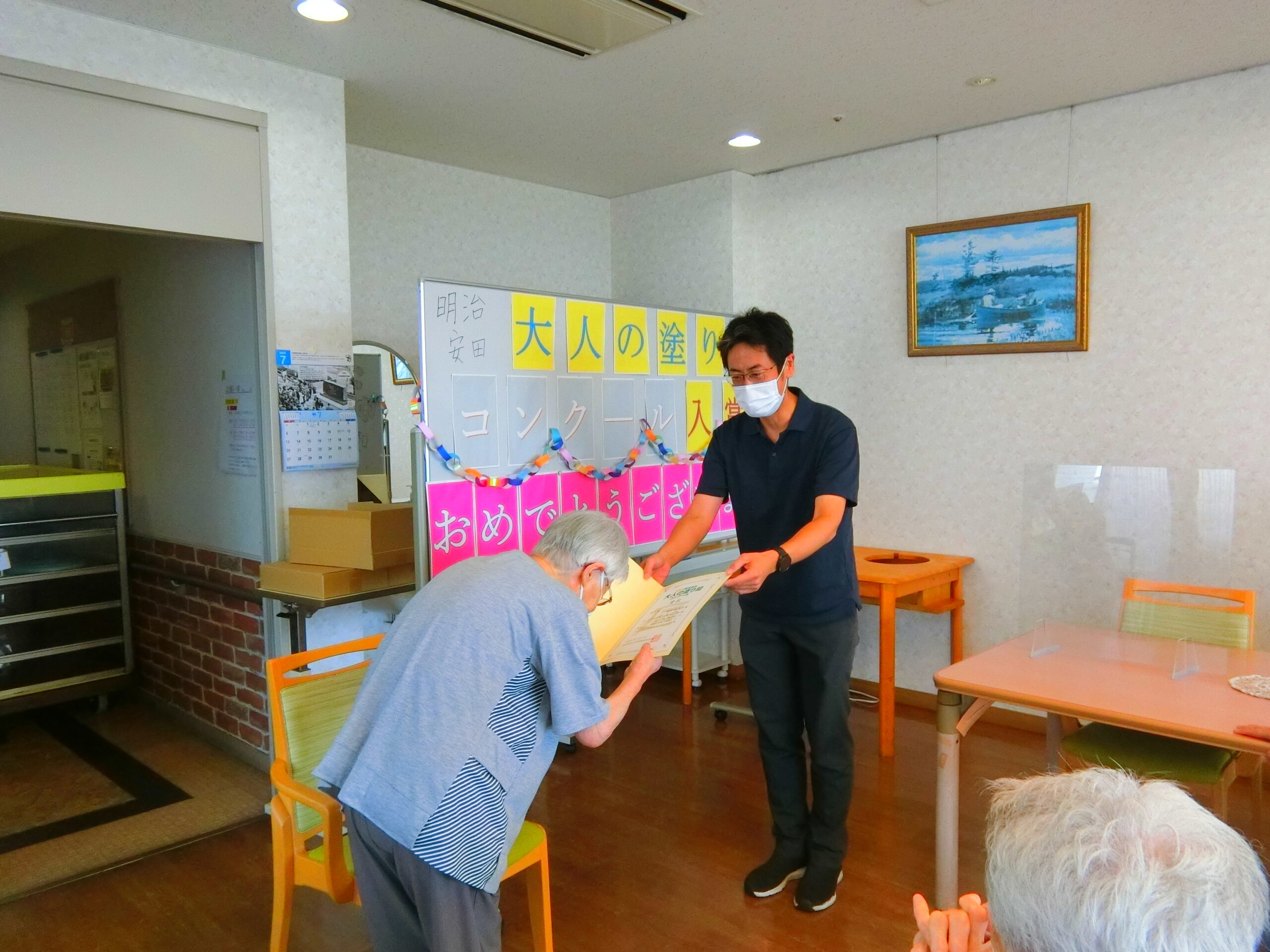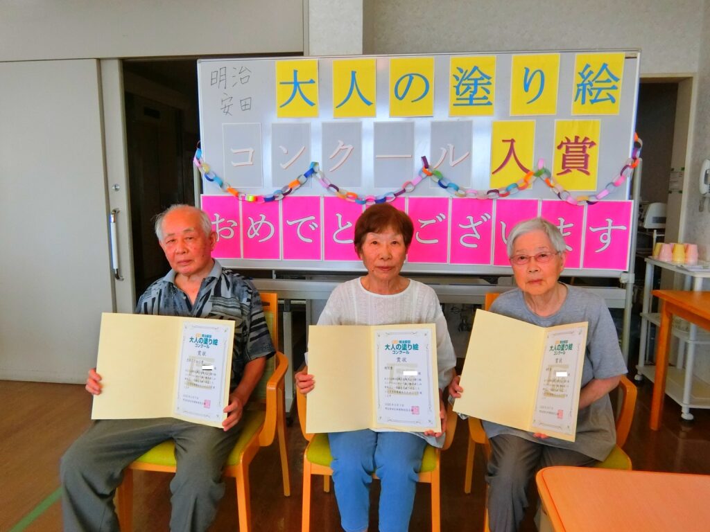 今年の冬に開催された「明治安田大人の塗り絵コンクール」に3名の入居者様が入賞し賞品が届きましたので、ケアハウスで表彰式を行いました。女性入居者様は、それぞれ「特別賞」を受賞。男性入居者様は提出した2枚の作品が両方共「色彩こだわり賞」を受賞されました。 入居者様の皆様が、自分のことのように喜んで下さり「どれ、見せて~」「凄いねえ」「本当の野菜みたい」「よくこんなふうに塗れるねえ」等、受賞された方々に拍手と優しい言葉を送られ、感動の表彰式となりました。