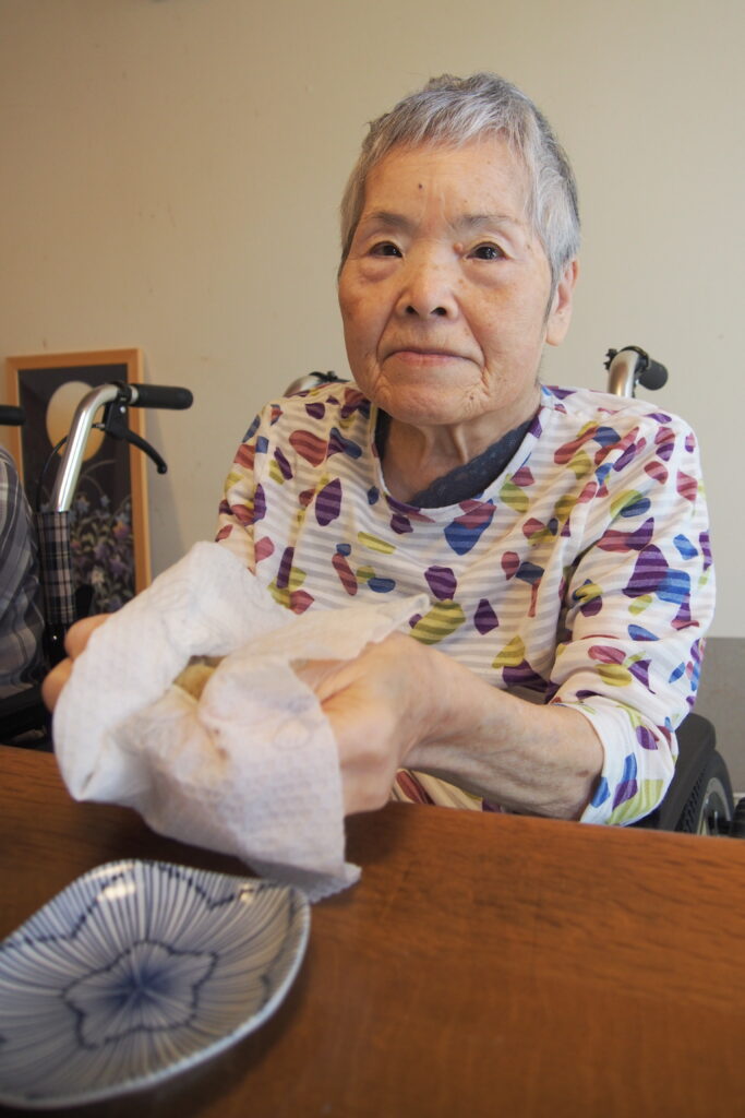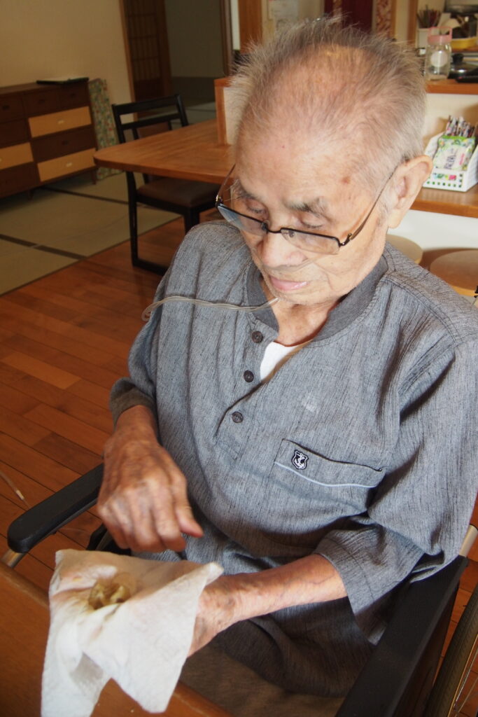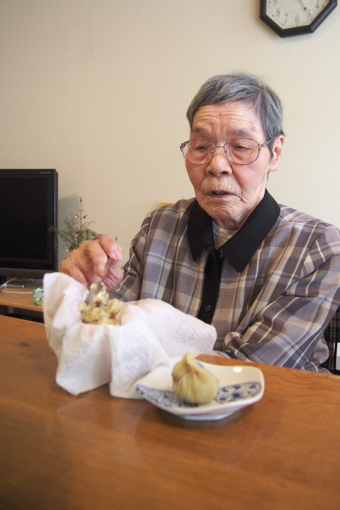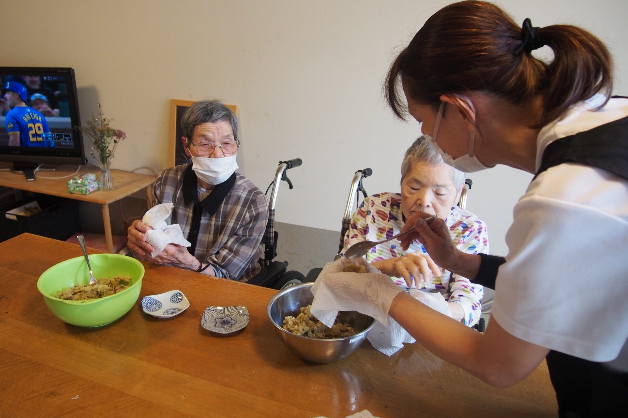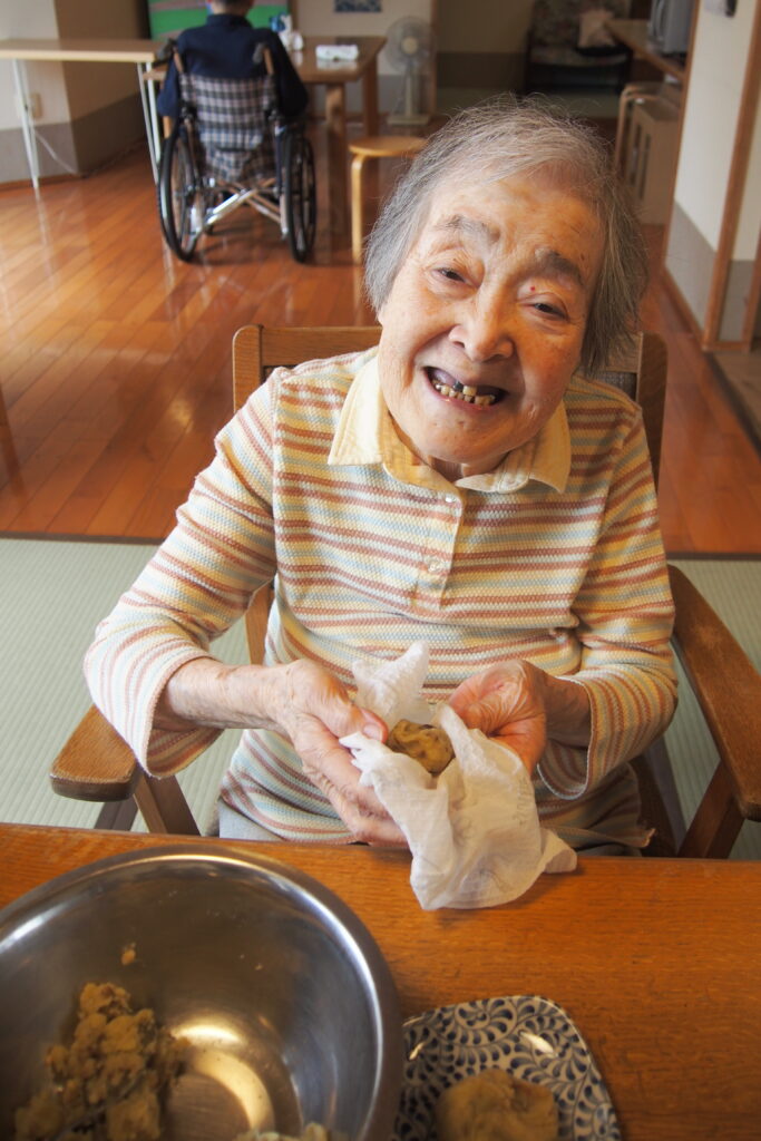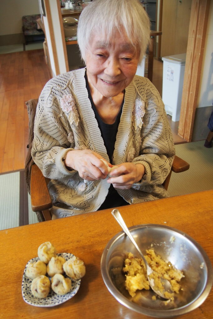 北の家で、秋の味覚を楽しんでいただこうと、さつまいもと栗を使ったきんとん作りを行いました。下ごしらえをした生地を茶巾に包んで絞る作業では、入居者の皆さんが丁寧に形を整えてくださり、見事に上品な仕上がりに。完成したきんとんを手に取り、「昔によく作ったわ」「懐かしい味ね」と、笑顔があふれました。