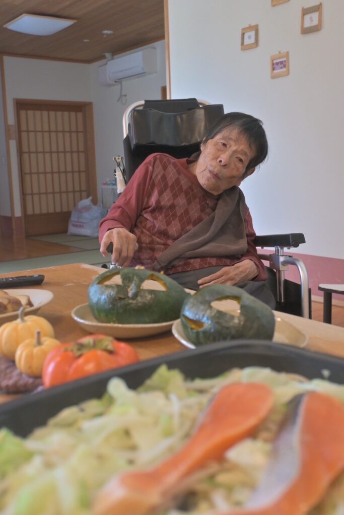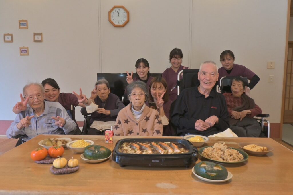 西の家では、季節を感じていただこうと秋の味覚を使ったランチを作りました。秋鮭やキノコ、カボチャなど、旬の食材をふんだんに使い、入居者の皆さんと職員が協力して調理を行いました。「香りがいいね」「昔はよく家で作ったよ」と話しながら、和やかな雰囲気の中で料理が完成。でき上がった秋のごちそうを味わいながら、自然と笑顔が広がるひとときとなりました。