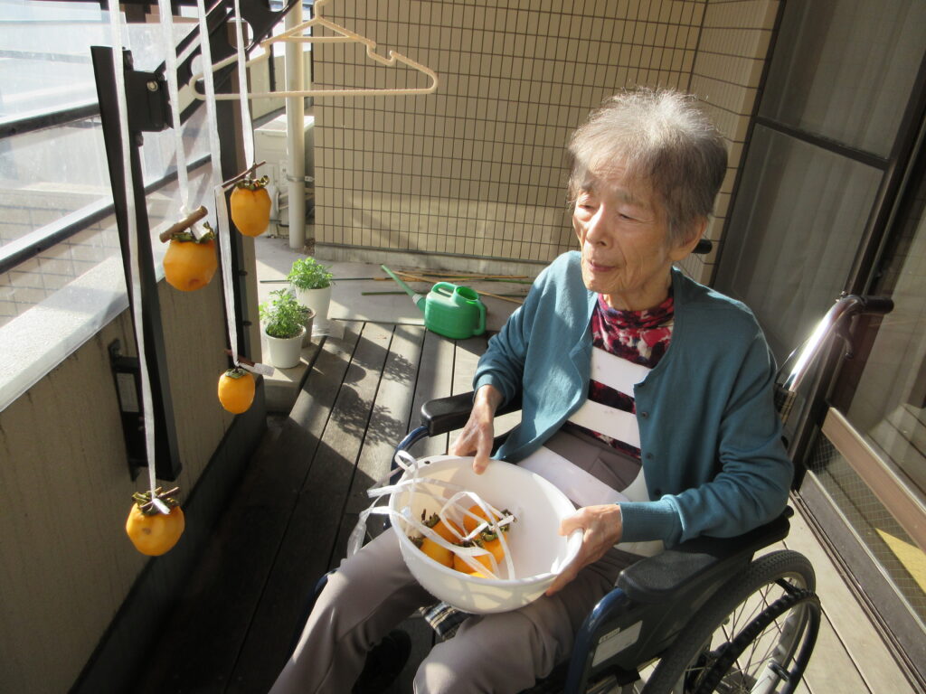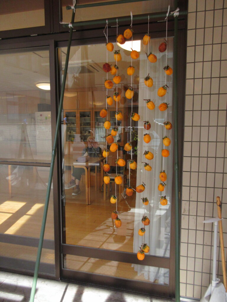 岩崎あいの郷の近隣の方より渋柿をいただきました。早速、各ユニットで干し柿作りをしました。