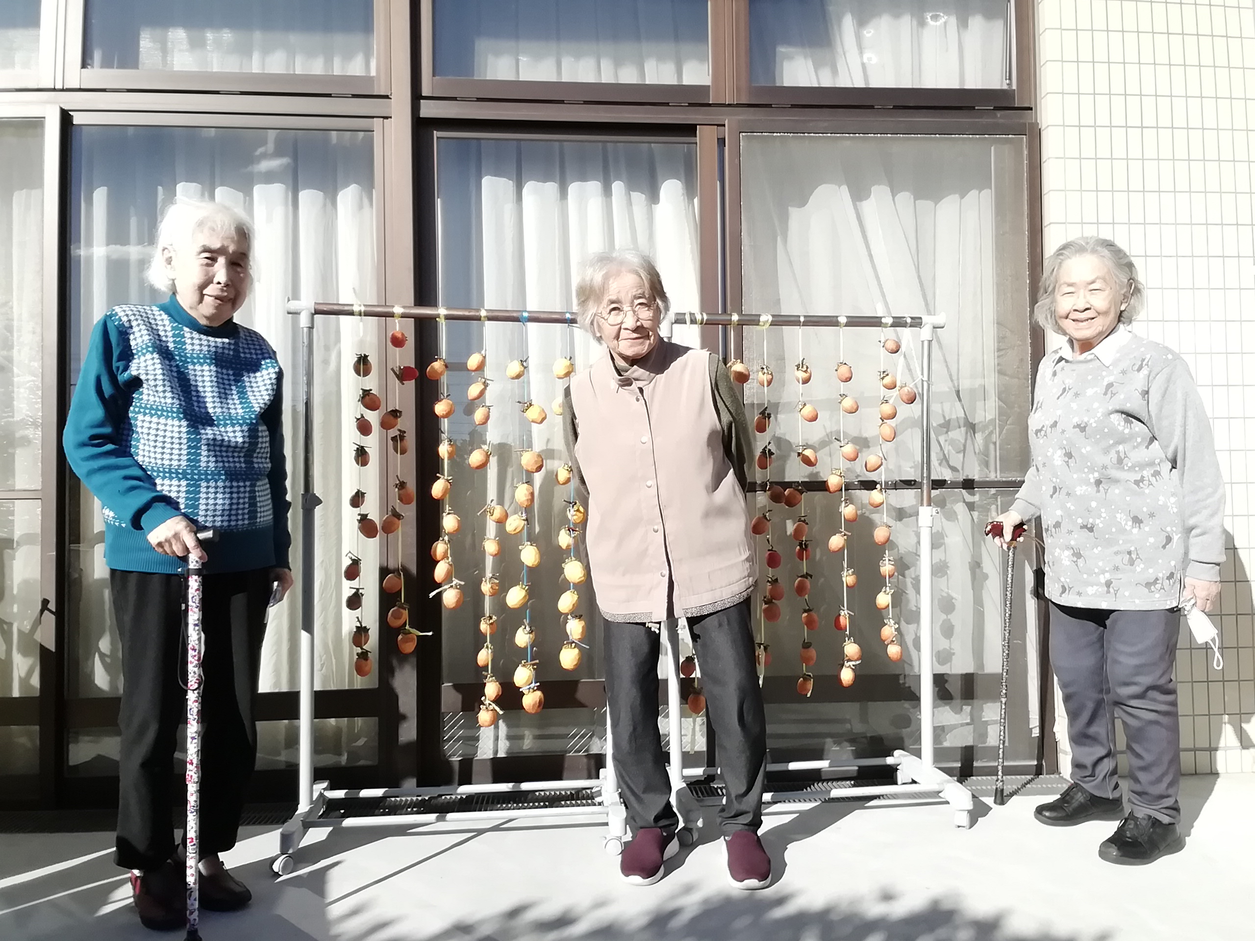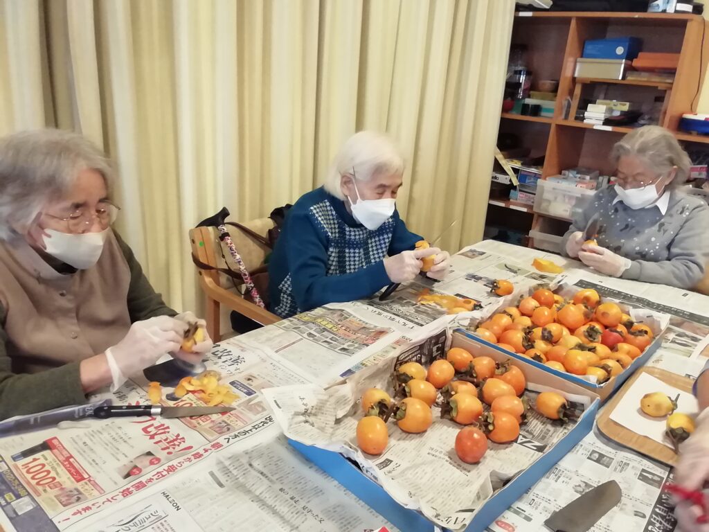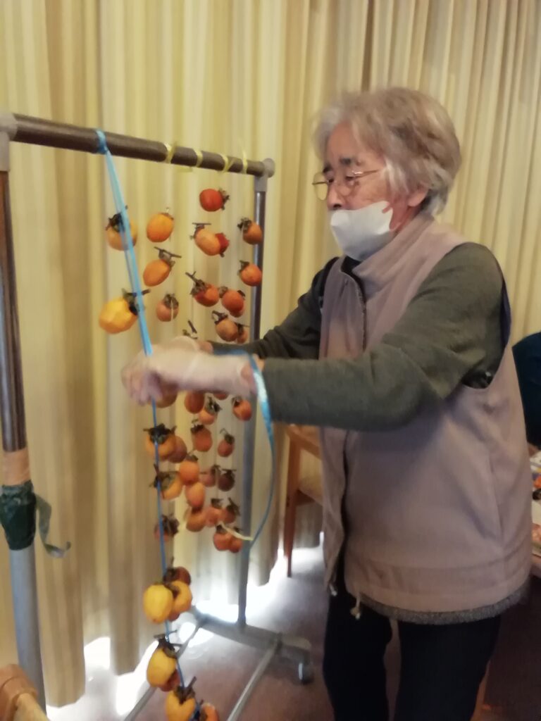 岩崎あいの郷 干し柿作り(デイサービス) 2025.11.05 今日の作品教室は干し柿作りです。いただいた渋柿の皮を剥き、紐でくくり干しました。皮むきも皆さん上手でヘタと枝を残して綺麗に剥いていました。「出来上がりが楽しみ~!」と皆さん口をそろえて仰ってました。