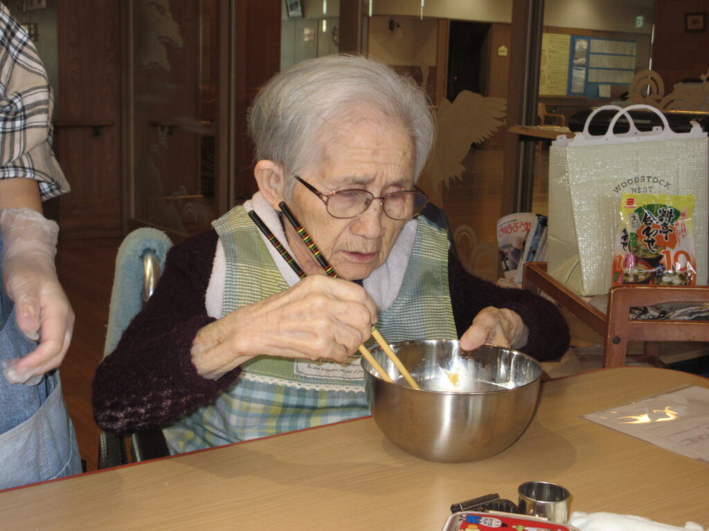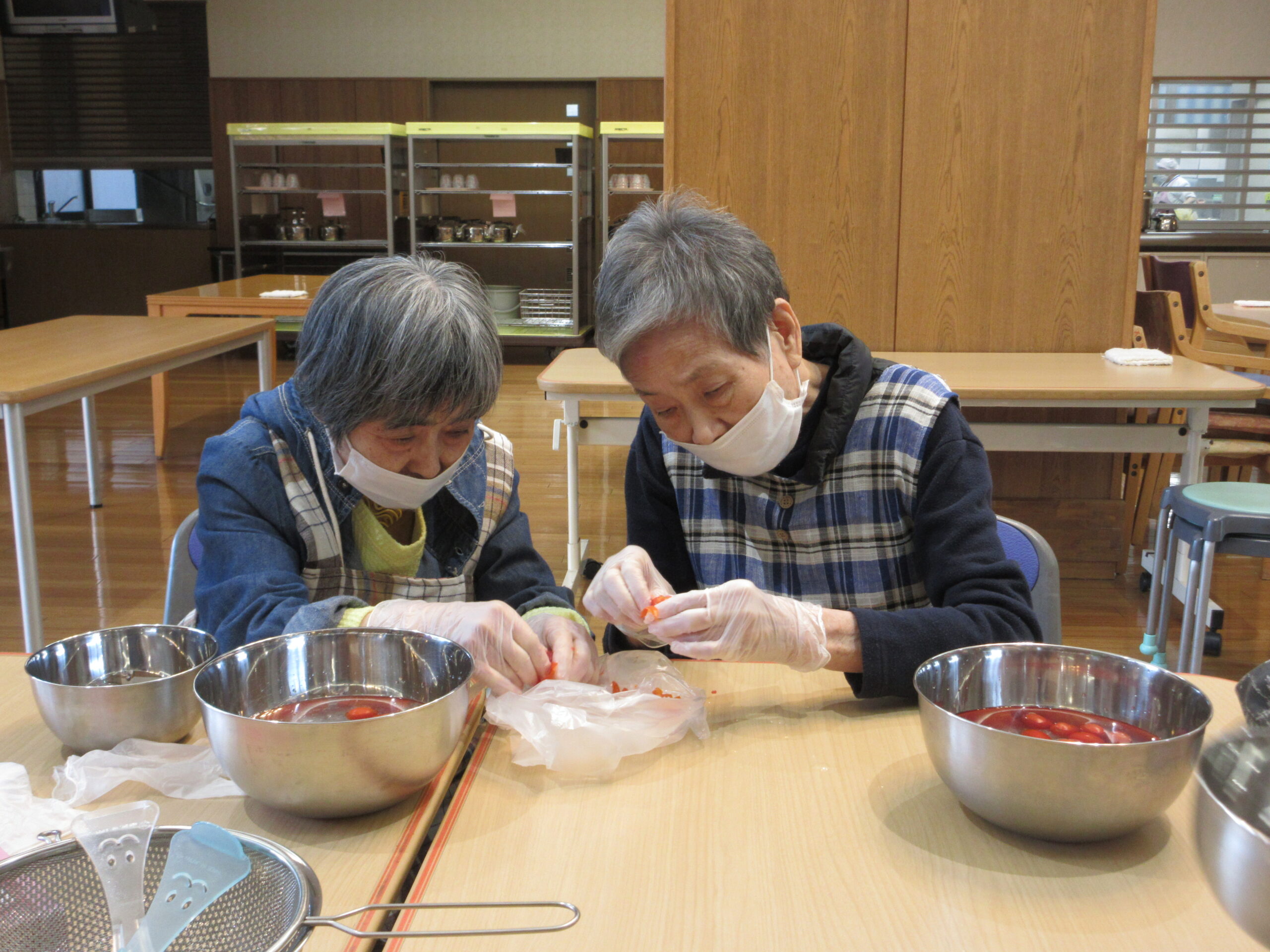 5月に種まきをしたミニトマトが、たくさん実を付けたので入居者様と一緒に“トマたまスープ”を作りました。栄養沢山のスープを飲んで、寒い季節も元気に過ごしていきましょう!
