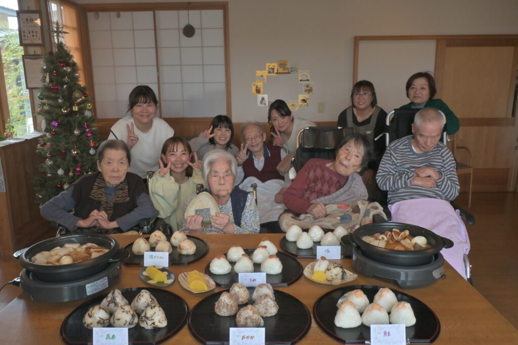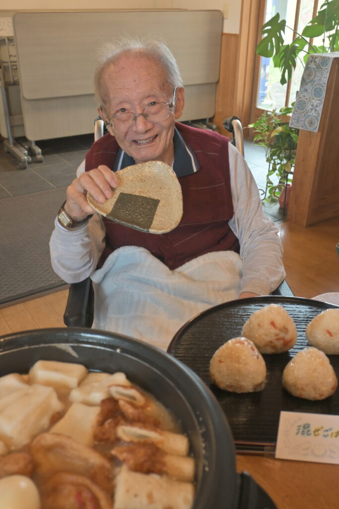 急に気温が下がり、鍋が恋しくなってきました。西の家では入居者の皆さんと一緒に「おでん」と「おにぎり」を昼食に作って食べました。鍋から漂うだしの香りに、「いい匂いだね」と声が上がり、大根やたまごが煮える様子に皆さん楽しそうに目を向けていました。おにぎり作りでは、鮭・梅・昆布などの具材を並べると、「どれにしようかな」と迷いながらも、嬉しそうに好きな具材を選ばれる姿がとても印象的でした。また、“おにぎり型のお皿”を手に持ってポーズをとる入居者もみえ、周囲は笑顔に包まれました。