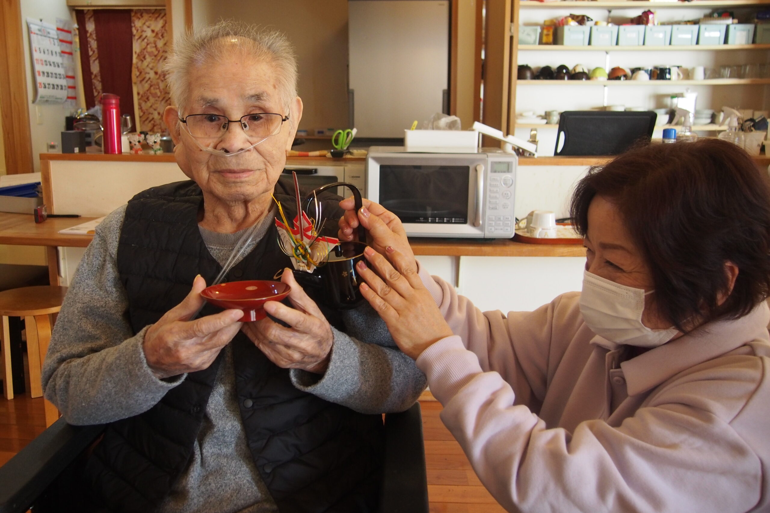 当日は、職員が由来を紹介しながら、一人ひとりにお屠蘇をお出ししました。杯を手に「今年も元気で過ごしたいね」「昔は家族で飲んだよ」と懐かしそうに話される姿も見られ、新年ならではの穏やかであたたかな時間となりました。