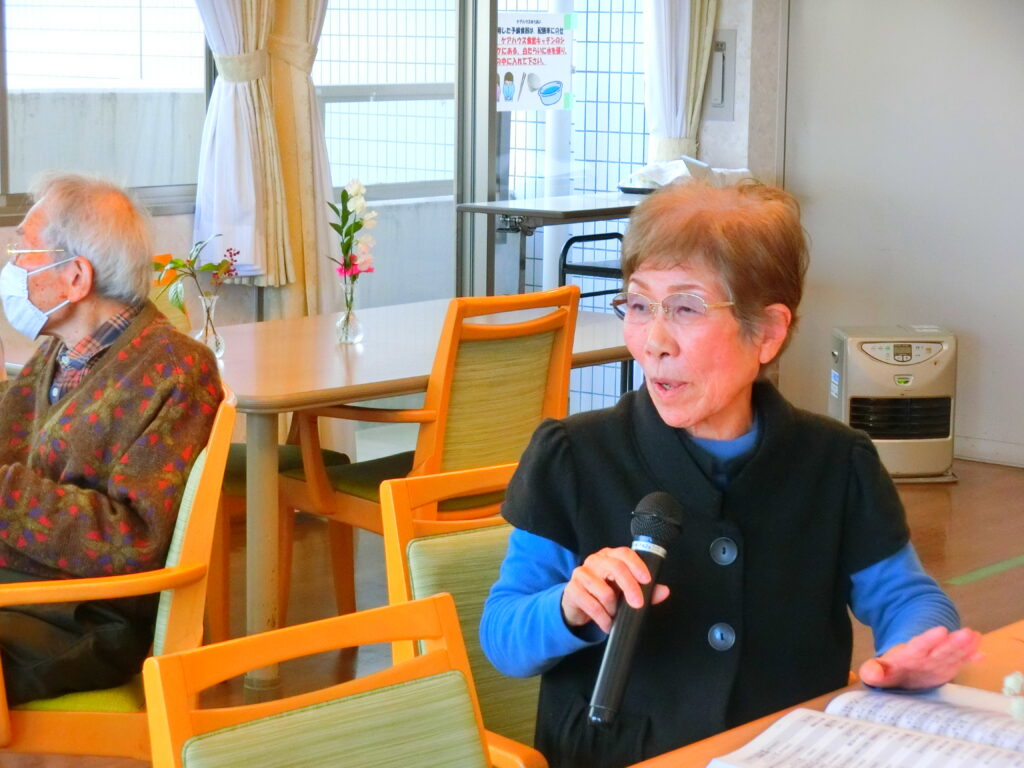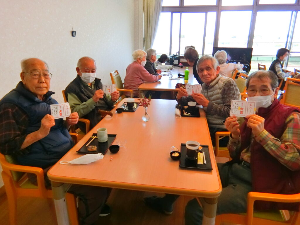 ケアハウスでは、正月3日に「カラオケ喫茶」を行いました。「おみくじ」を引いていただき、お茶菓子も同時に入っている為、大小あるお饅頭を見比べたり「大吉~」「小吉~」との声も聞かれました。カラオケを楽しまれ、ラストは全員で「青い山脈」を大合唱して笑顔いっぱいの新年会になりました。