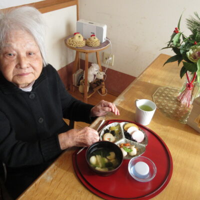 ケアハウスでは、正月3日に「カラオケ喫茶」を行いました。「おみくじ」を引いていただき、お茶菓子も同時に入っている為、大小あるお饅頭を見比べたり「大吉~」「小吉~」との声も聞かれました。カラオケを楽しまれ、ラストは全員で「青い山脈」を大合唱して笑顔いっぱいの新年会になりました。