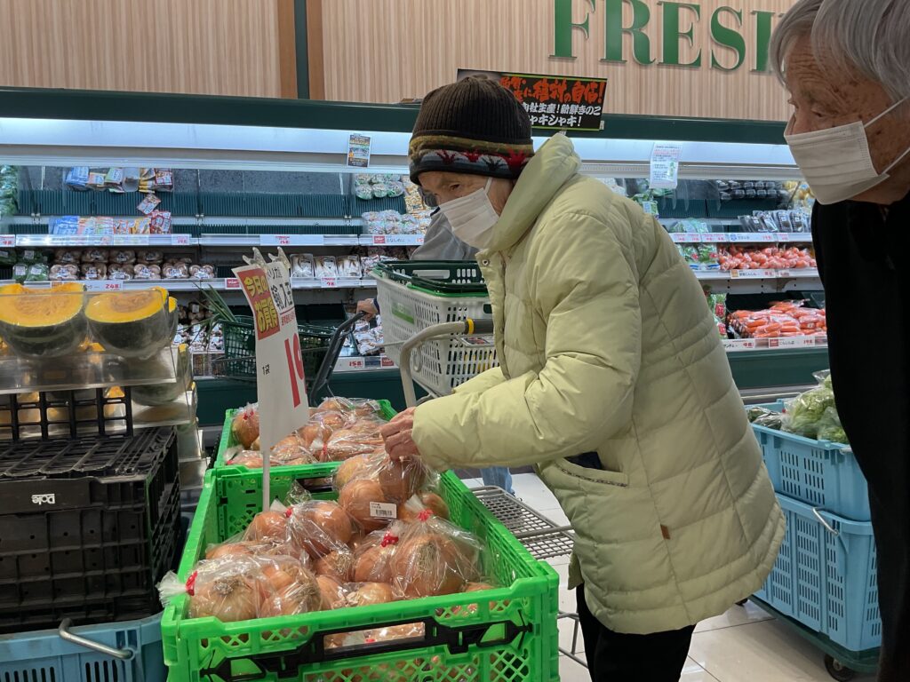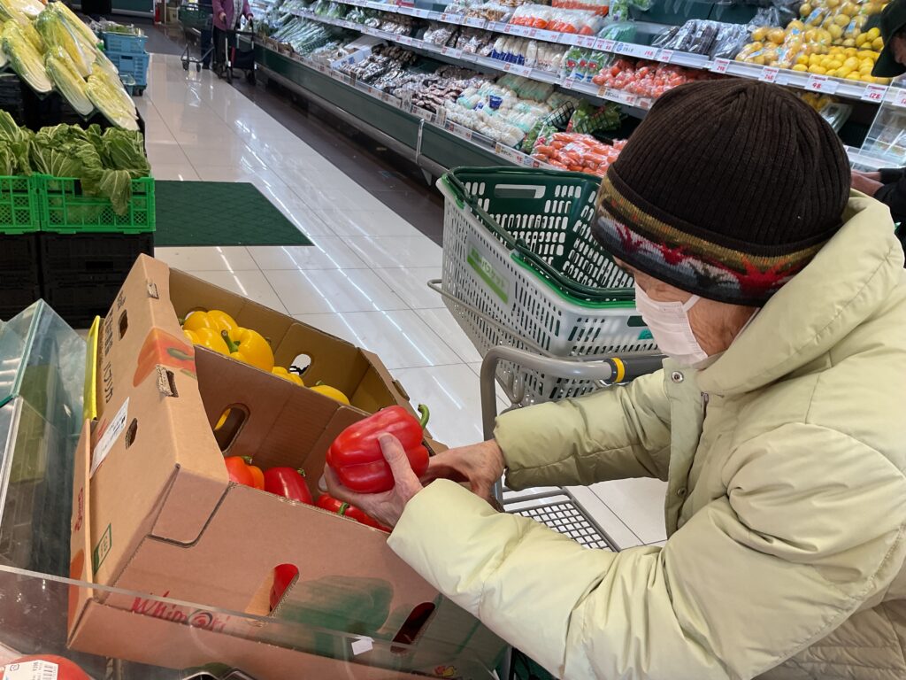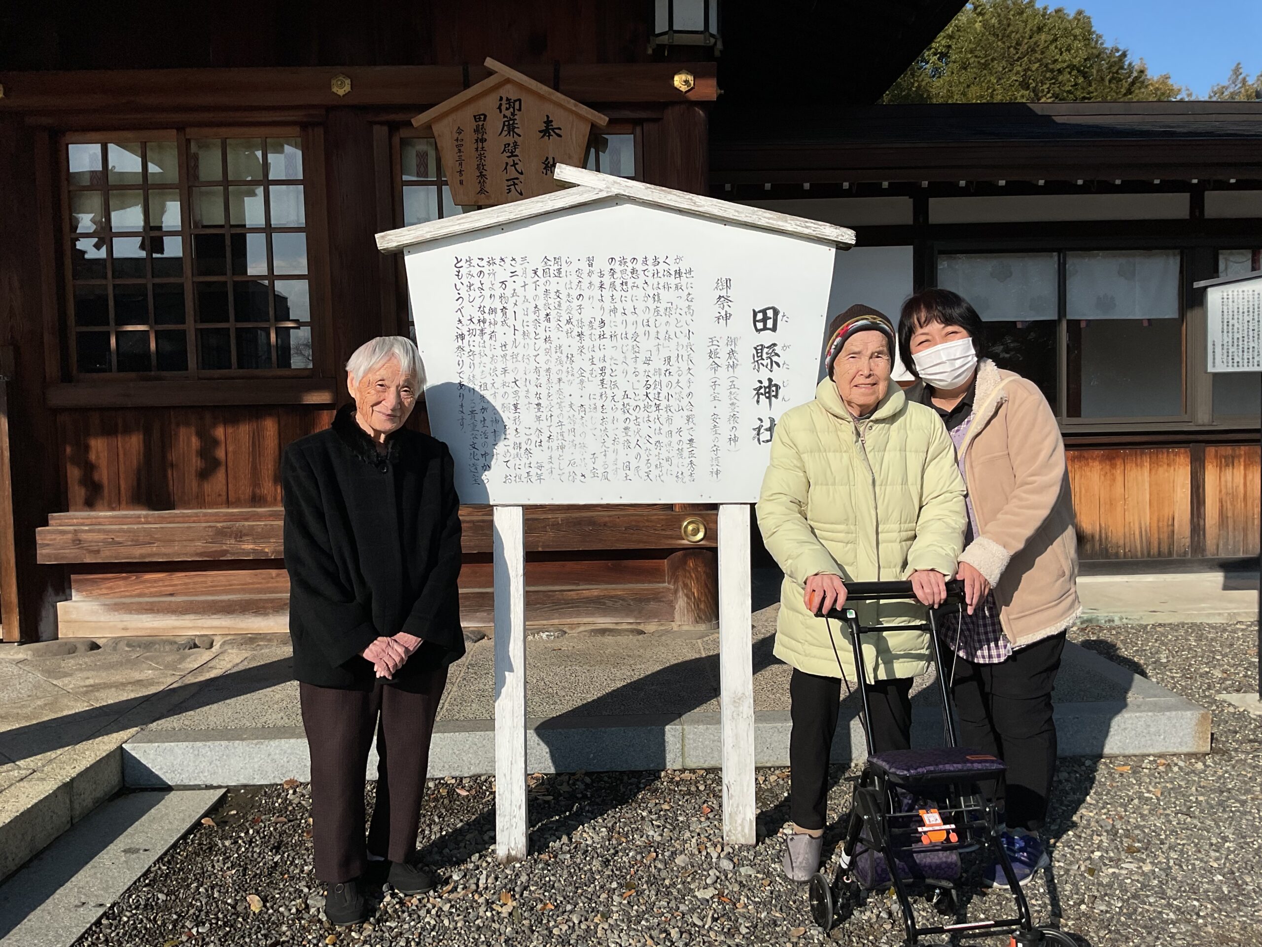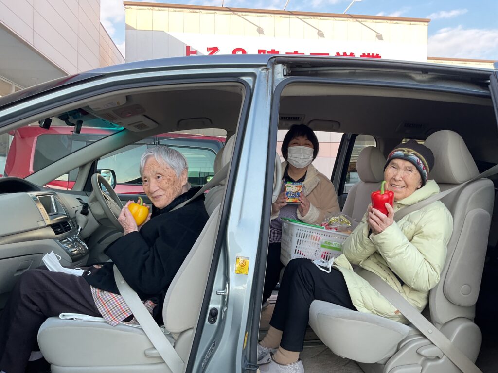 岩崎あいの郷 1月のお出かけ(グル-プホ-ム) 2026.01.13 『田県神社へお参りに行きたいわ』と以前、言っていらしたので、どんど焼きの前日に行って参りました。帰り道にスーパーマーケットへ立ち寄り、野菜や果物などの買い物をしてきました。『どっちがいいかなぁ、こっちがいいね』と選んでくださいました。 『久しぶりに来たわぁ』と懐かしそうなご様子でした。 『赤い方が、美味しそうね』 『こっちの方がお買い得みたいね』 『楽しかったぁ』『また来ましょうね』『美味しいピザトーストを作ってね』