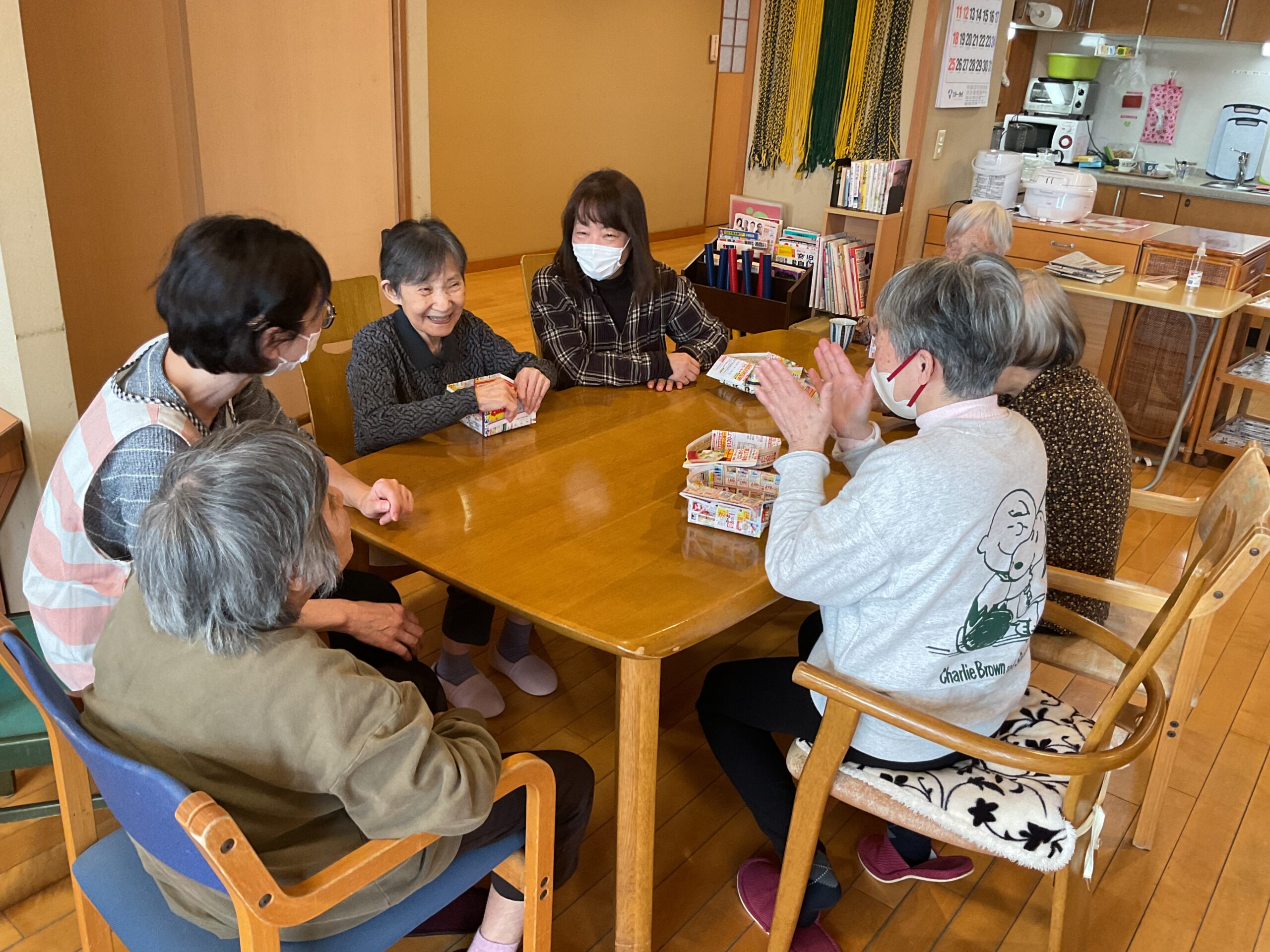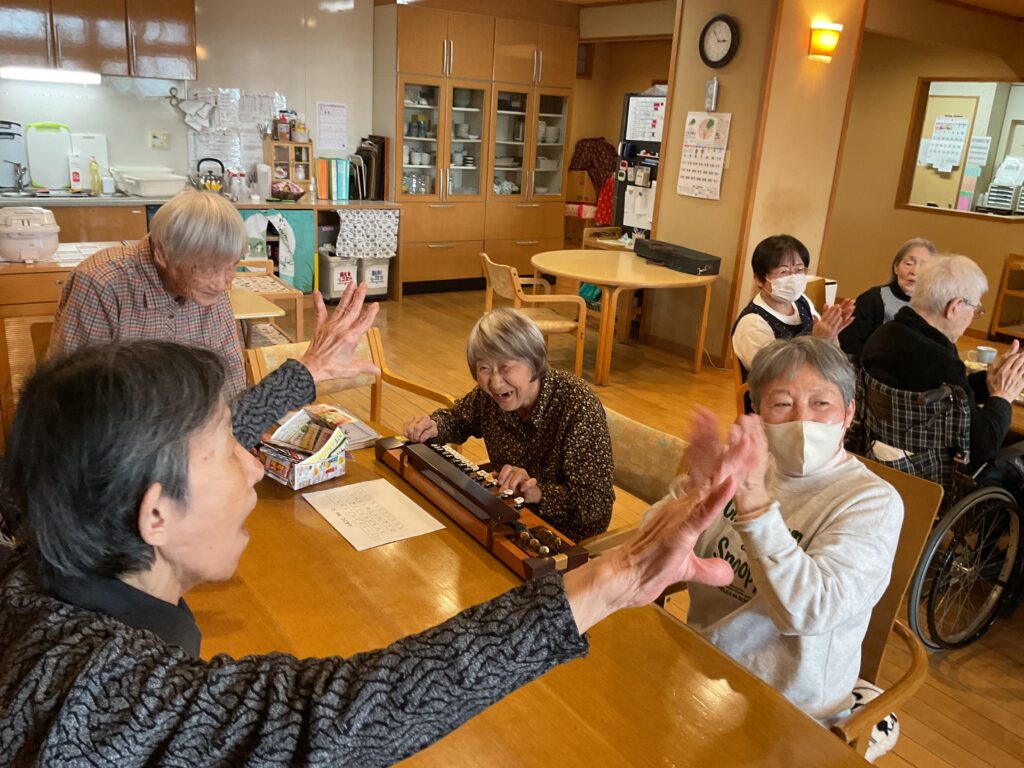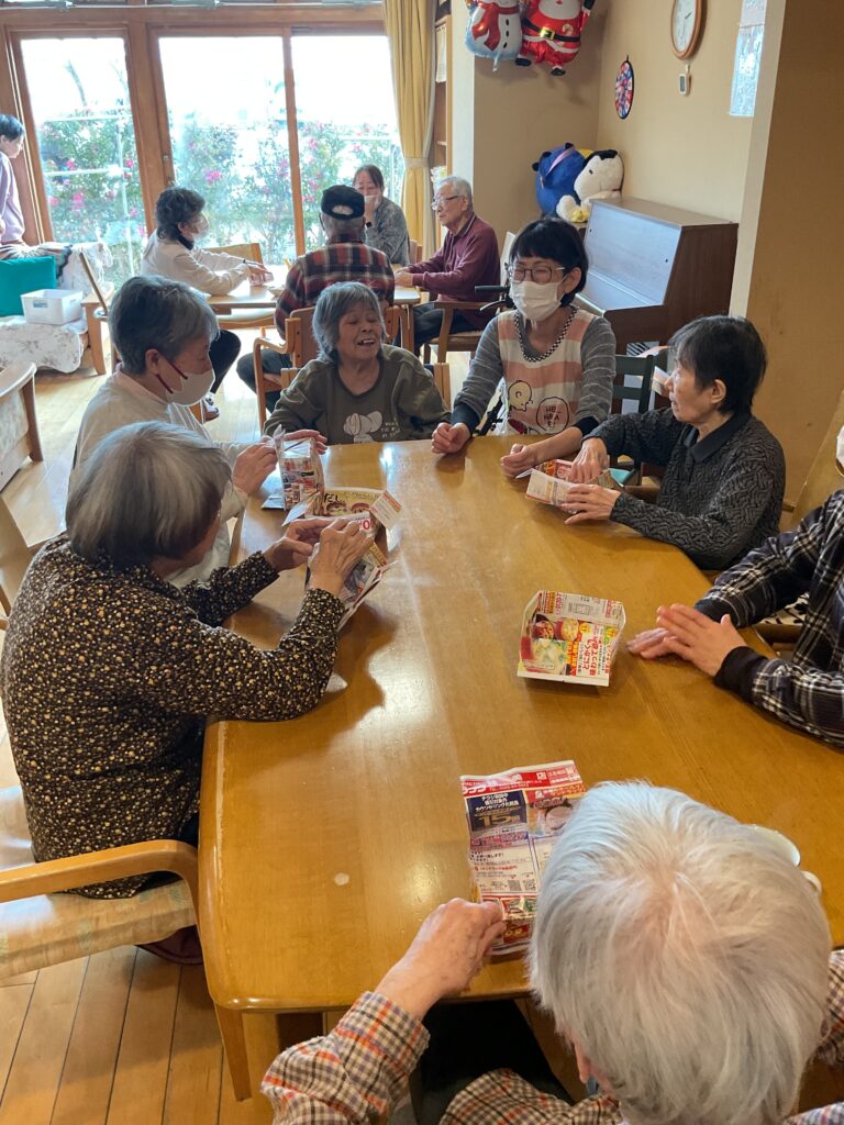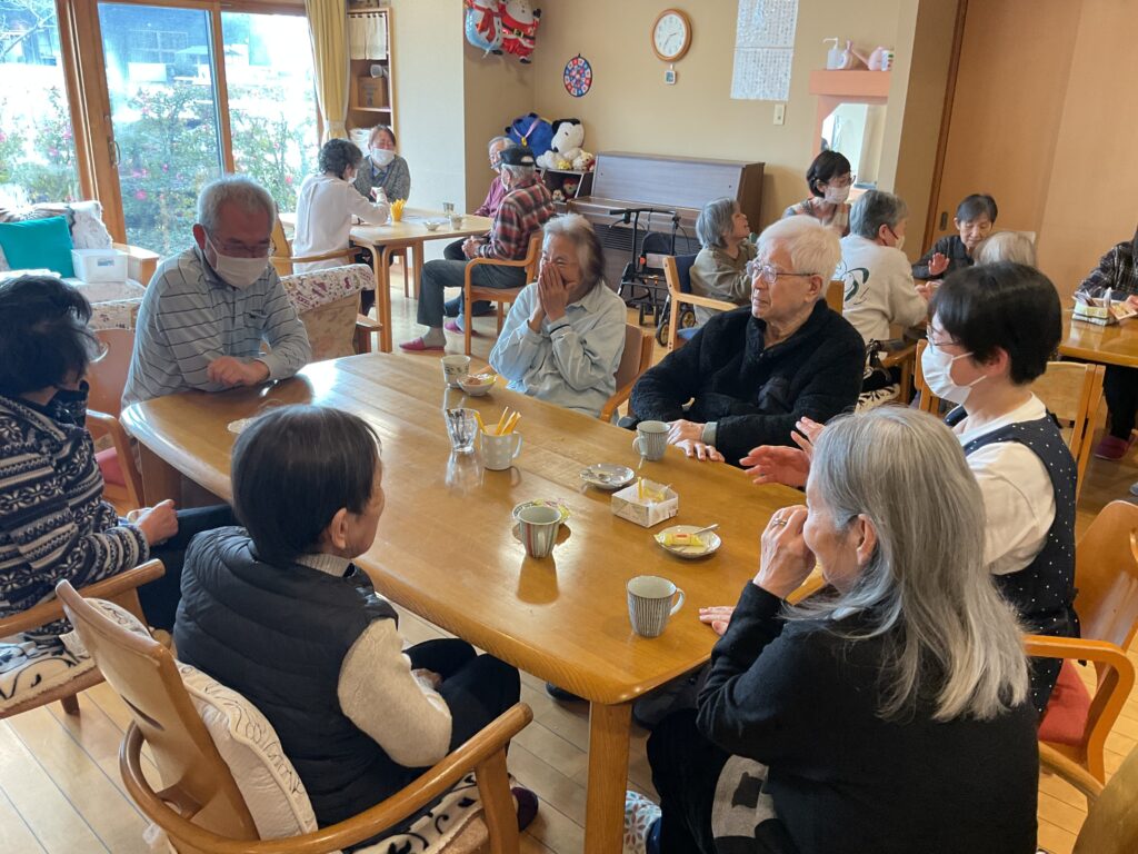 地域の方たちが訪ねて来てくださいました。『こんにちは。おじゃまします』『初めまして、よくいらしてくださいました。どうぞゆっくりしていってくださいね。』と、ご入居者様は大歓迎のご様子でした。それぞれのテーブルで会話が弾み、笑い声がして、歌をうたったり、とても賑やかで楽しいひと時でした。お見送りの時には「是非、また来てくださいね」「ええ、もちろん。必ずまた来ます。」と握手を交わしていらっしゃいました。
