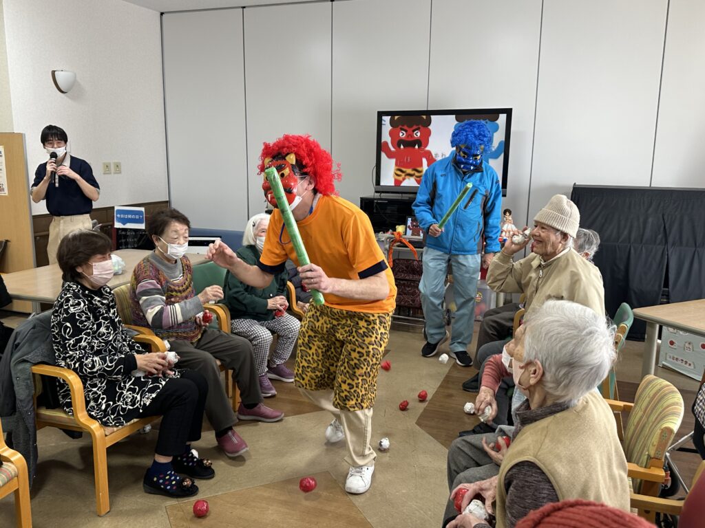 今年もどこからともなく鬼が登場…と思いきや、正体は見覚えのある職員の鬼姿!利用者の皆さまはすぐに見破りつつも、「鬼は外!」の元気な掛け声とともに豆を投げ、鬼退治は大いに盛り上がりました。