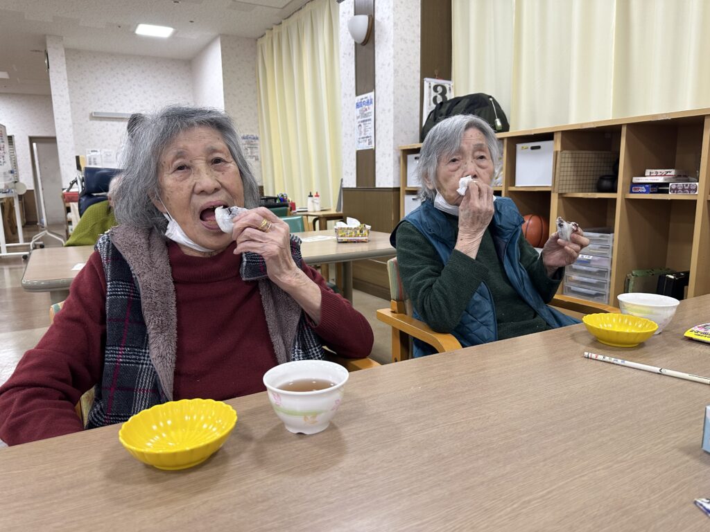 豆まきの後は、節分の豆にちなんだ“豆大福”のおやつタイム。「鬼よりこっちが楽しみ」との声も聞こえ、和やかなひとときを過ごしていただきました。