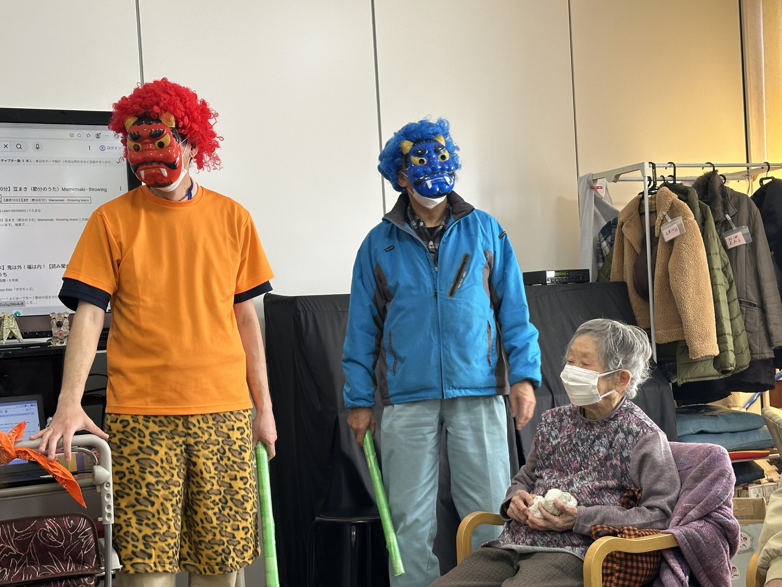 今年もどこからともなく鬼が登場…と思いきや、正体は見覚えのある職員の鬼姿!利用者の皆さまはすぐに見破りつつも、「鬼は外!」の元気な掛け声とともに豆を投げ、鬼退治は大いに盛り上がりました。