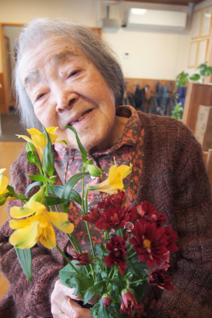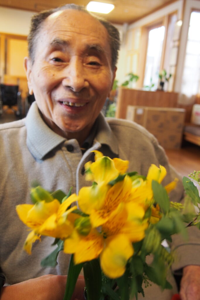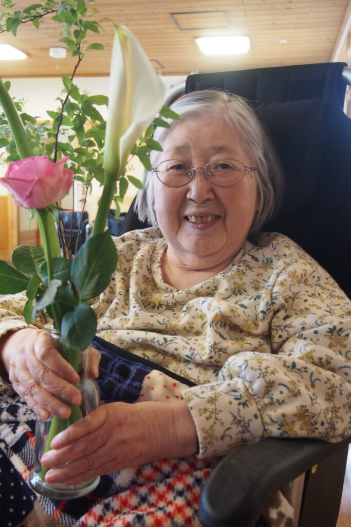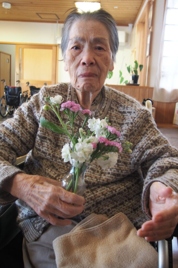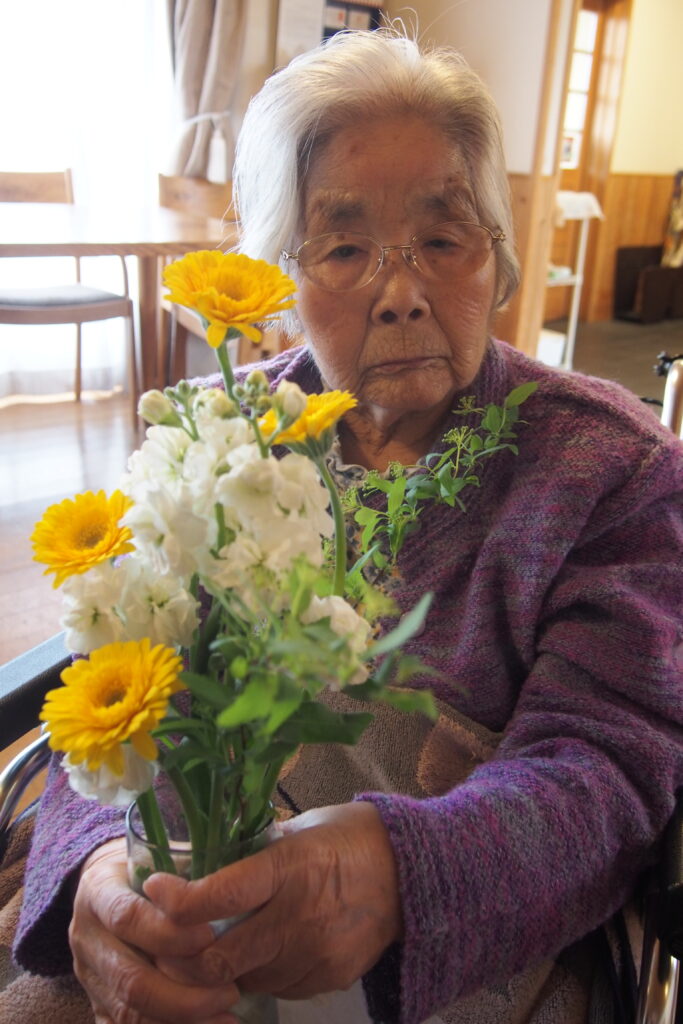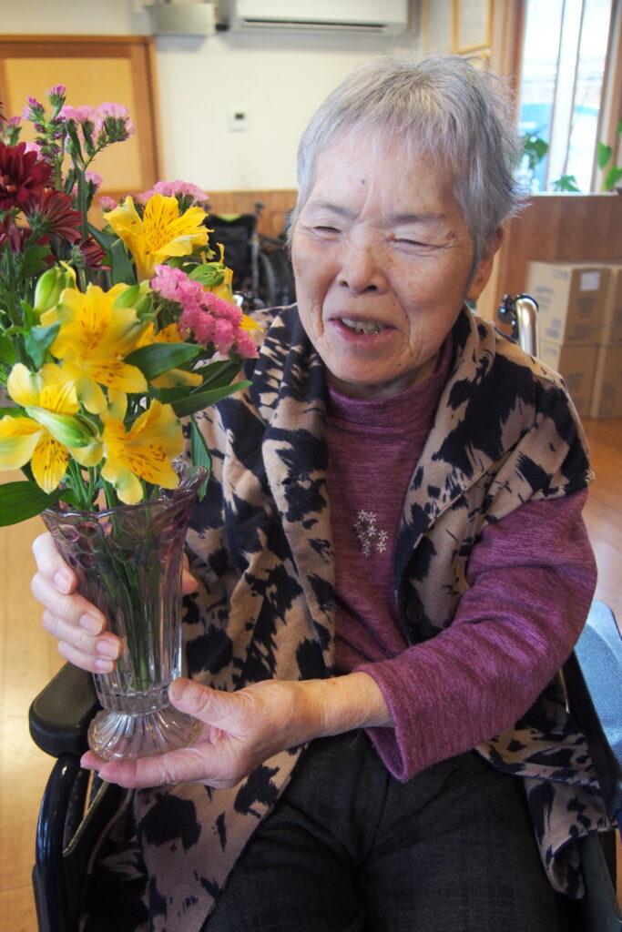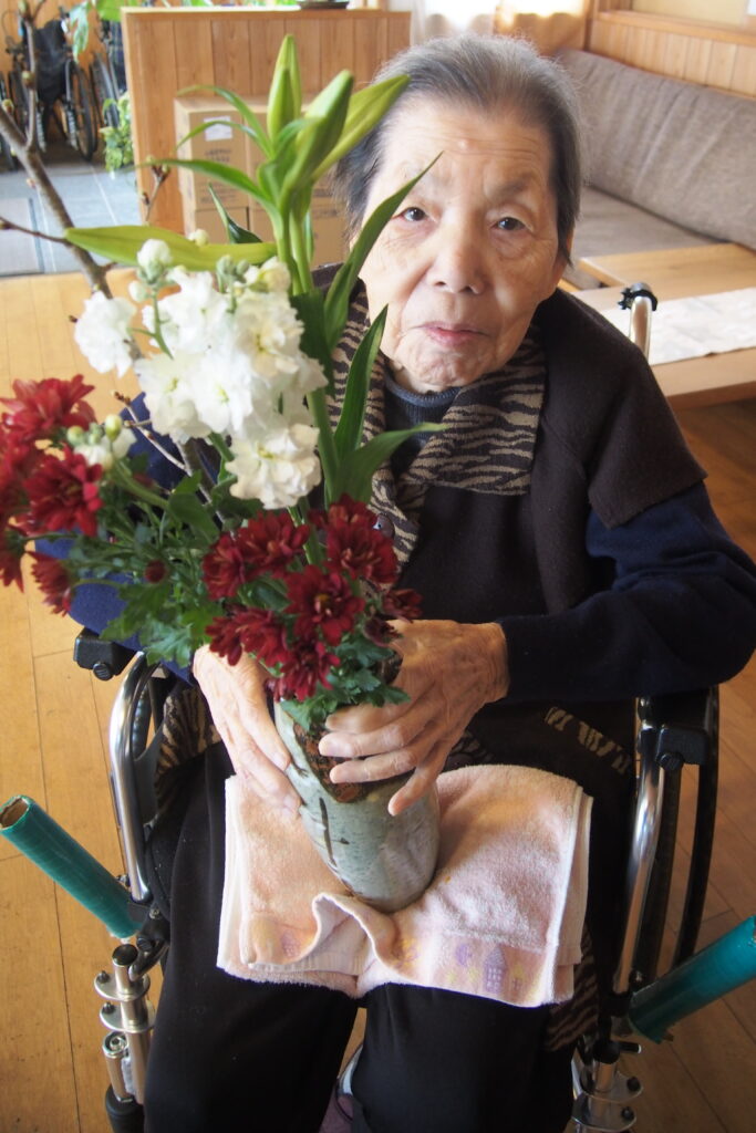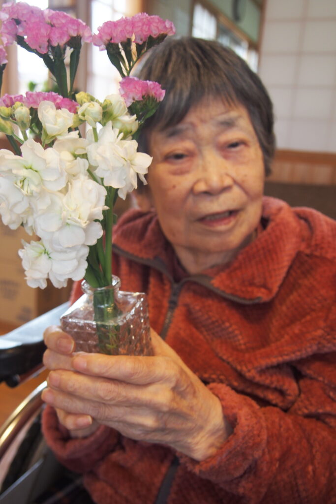 今月も施設に季節のお花が届き、入居者の皆さまに花器への生け込みを楽しんでいただきました。色とりどりの花々の中には、ふっくらとした桜のつぼみが付いた枝もあり、「もうすぐ春だね」と自然と笑みがこぼれます。長さや向きを考えながら一本一本丁寧に生ける姿は真剣そのもの。完成した作品を見て、男性も女性も「きれいだね」と顔を見合わせ、にこにこと穏やかな表情に包まれていました。まだ寒さの残る季節ですが、花とともにひと足早い春の訪れを感じる、温かなひとときとなりました。