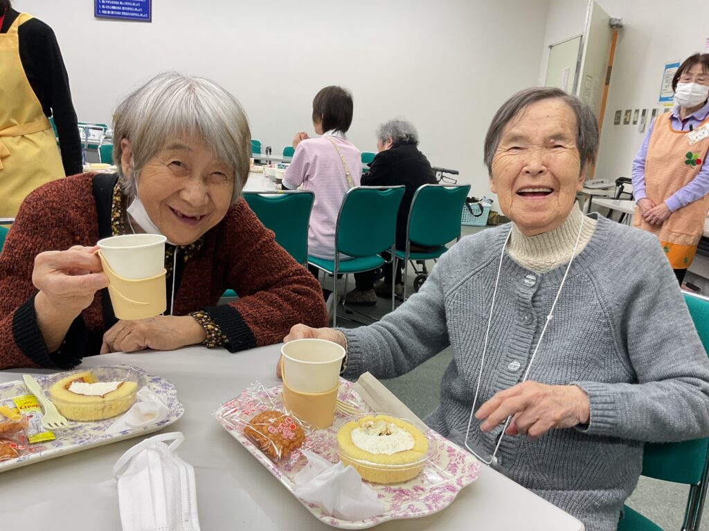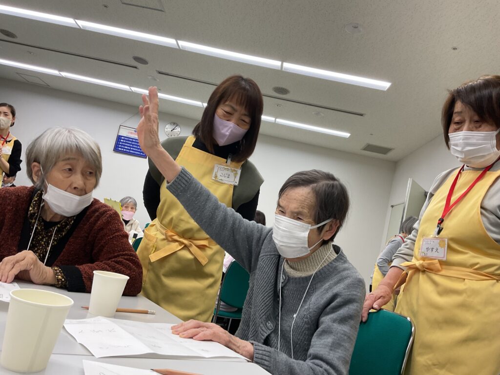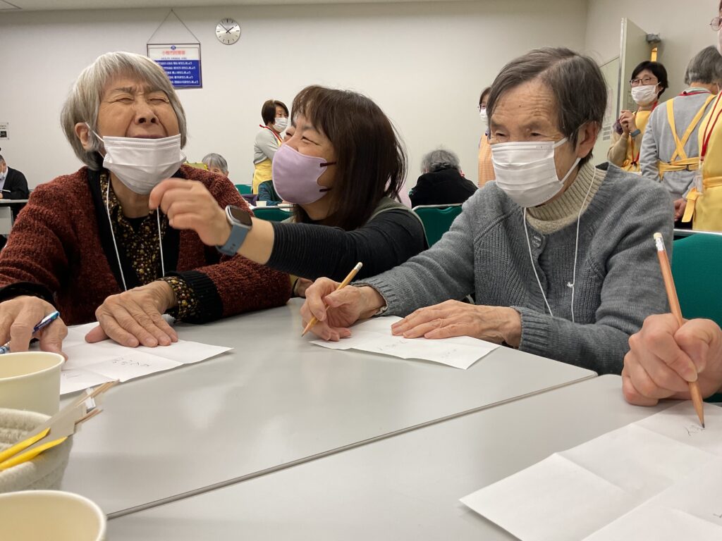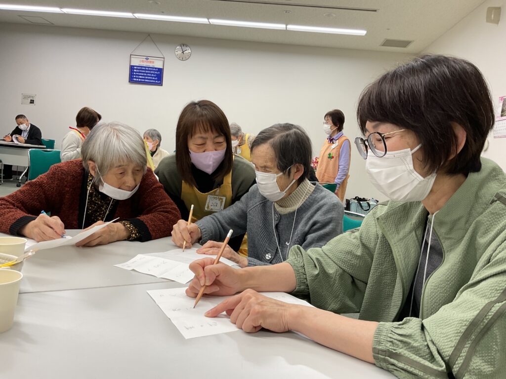 毎月のオレンジカフェを楽しみにしていらっしゃいます。「今月も来てくださったんですね」とボランティアさんに声をかけていただいて、とても嬉しそうにされていました。広告の白い面を活用して、ビンゴゲームが始まりました。テーマは“春”のことばでした。「えぇ…と、さくら、あとは何かしら」「春と言えば?」「あっ!思いついた。」と、賑やかな雰囲気で楽しんでいらっしゃいました。揃ったところで、「ビンゴー!」と盛り上がっていました。