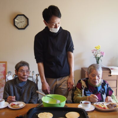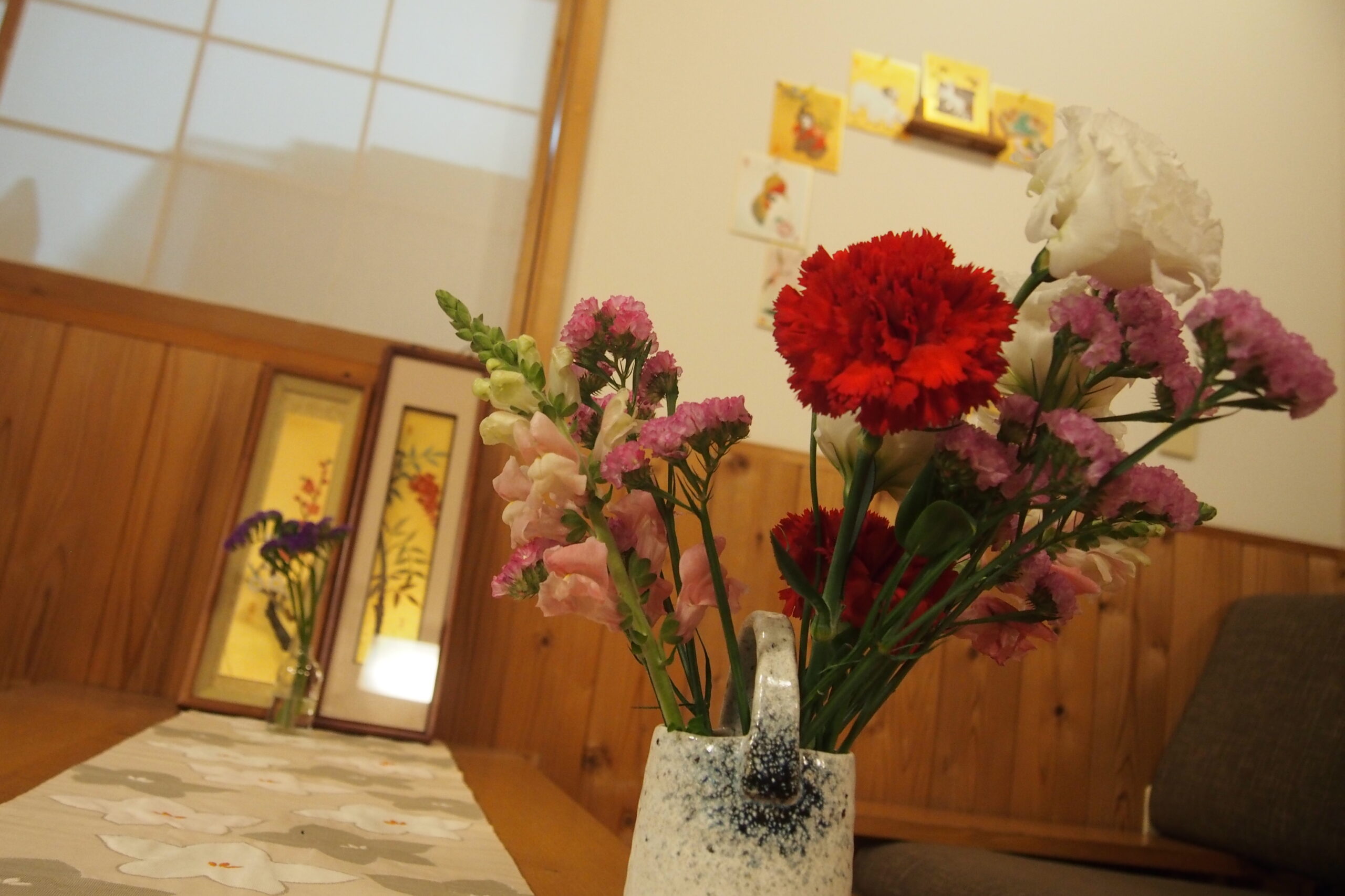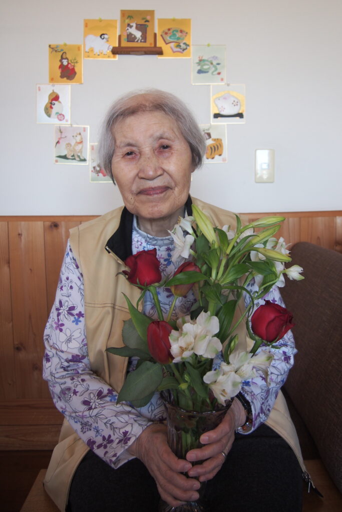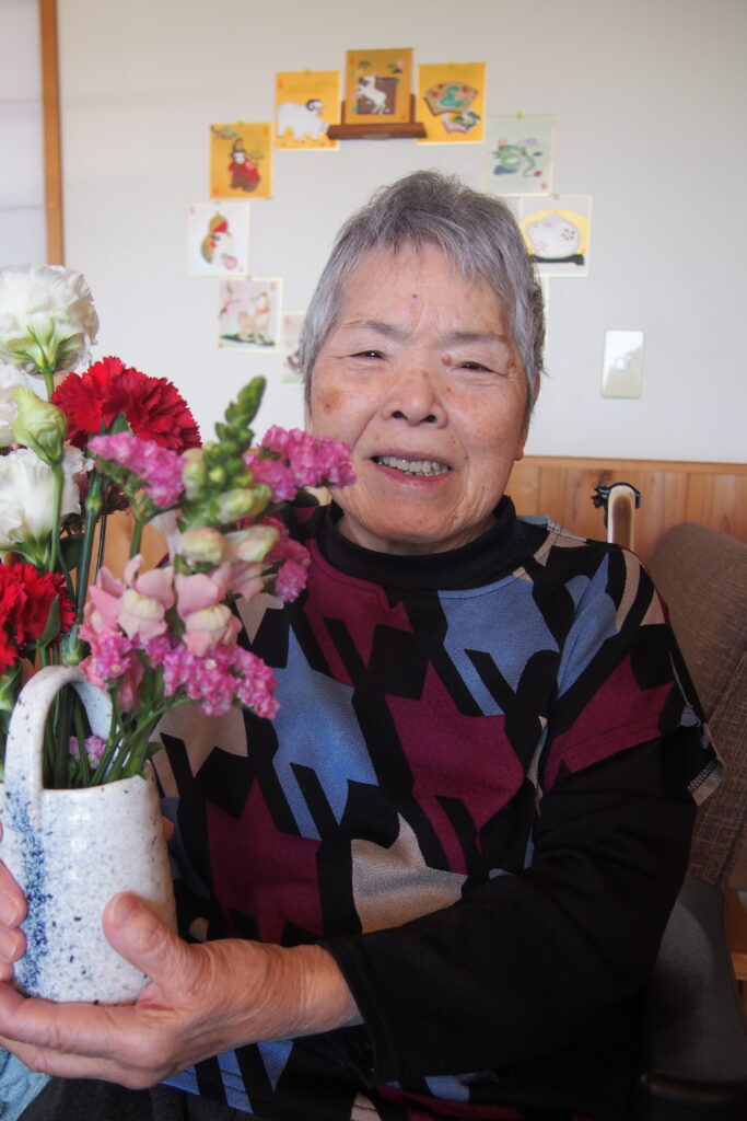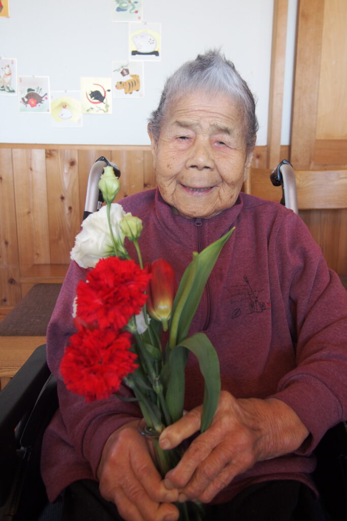 今月も施設に季節のお花が届き、入居者の皆さまに花器への生け込みを楽しんでいただきました。今回は、カーネーションやバラ、チューリップなど色鮮やかな花々が多く、箱を開けた瞬間から「きれいだね」「華やかだね」と歓声が上がりました。特に女性の入居者の皆さまは大変喜ばれ、思わず笑顔がこぼれます。外は初夏を思わせるような暖かい日となり、やわらかな陽ざしの中での生け花は、より一層明るく心弾む時間となりました。長さや向きを考えながら一本一本丁寧に生け、完成した作品を見ては「素敵にできたね」と互いに声を掛け合う姿が印象的でした。